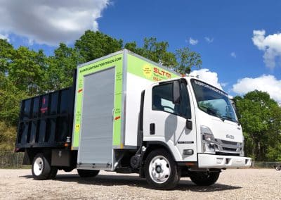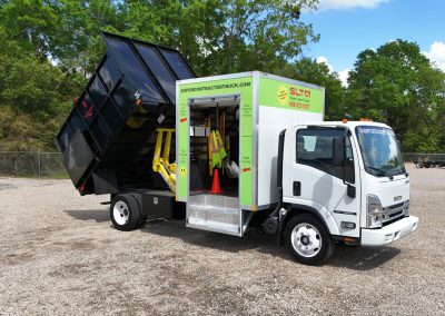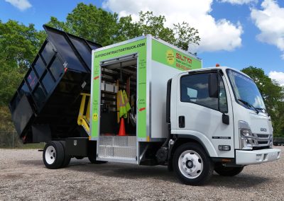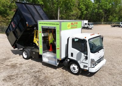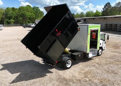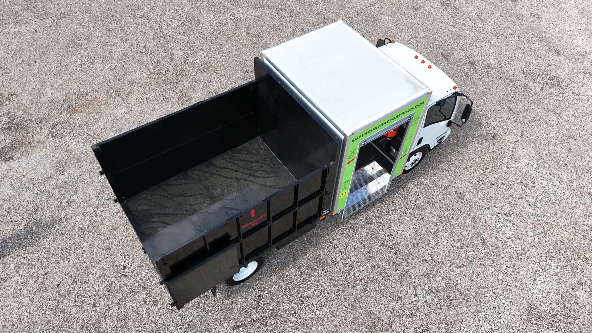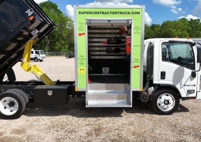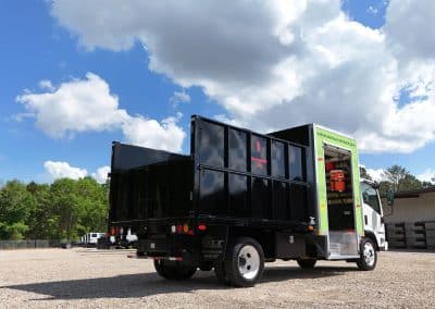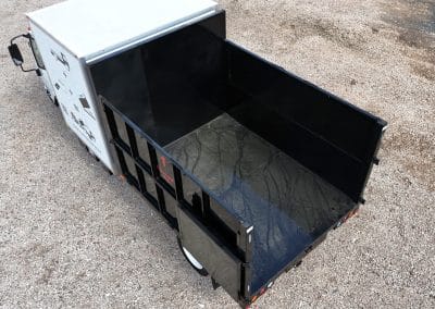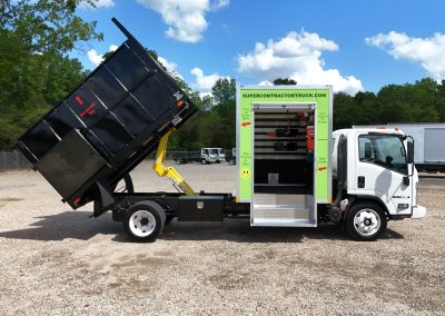 You’ve got your water cooler, and a mini fridge in there, which the power inverter is strong enough to run to keep workers properly hydrated on site. How about this? We’ve got a ten foot long by eight foot wide by six foot high dumping chip box. Our chip box is pretty unique. We’ve got fold down sides, a built in vice for servicing your saws and equipment, and under body tool storage boxes to put more gear.