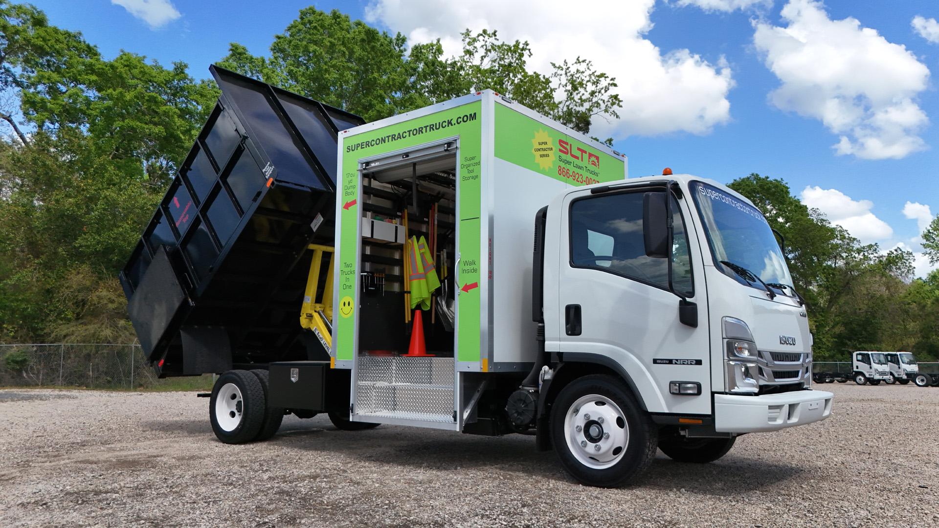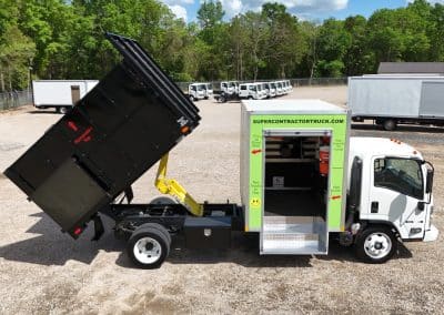 We begin with the Isuzu NRR cab chassis. This truck with the body package has about ten thousand pounds of cargo capacity and is really nicely equipped. We’ve got the six foot enclosed tool storage area. And if you go inside, you’re gonna see more than thirty hand and power tools that are nicely organized and secure for transport.